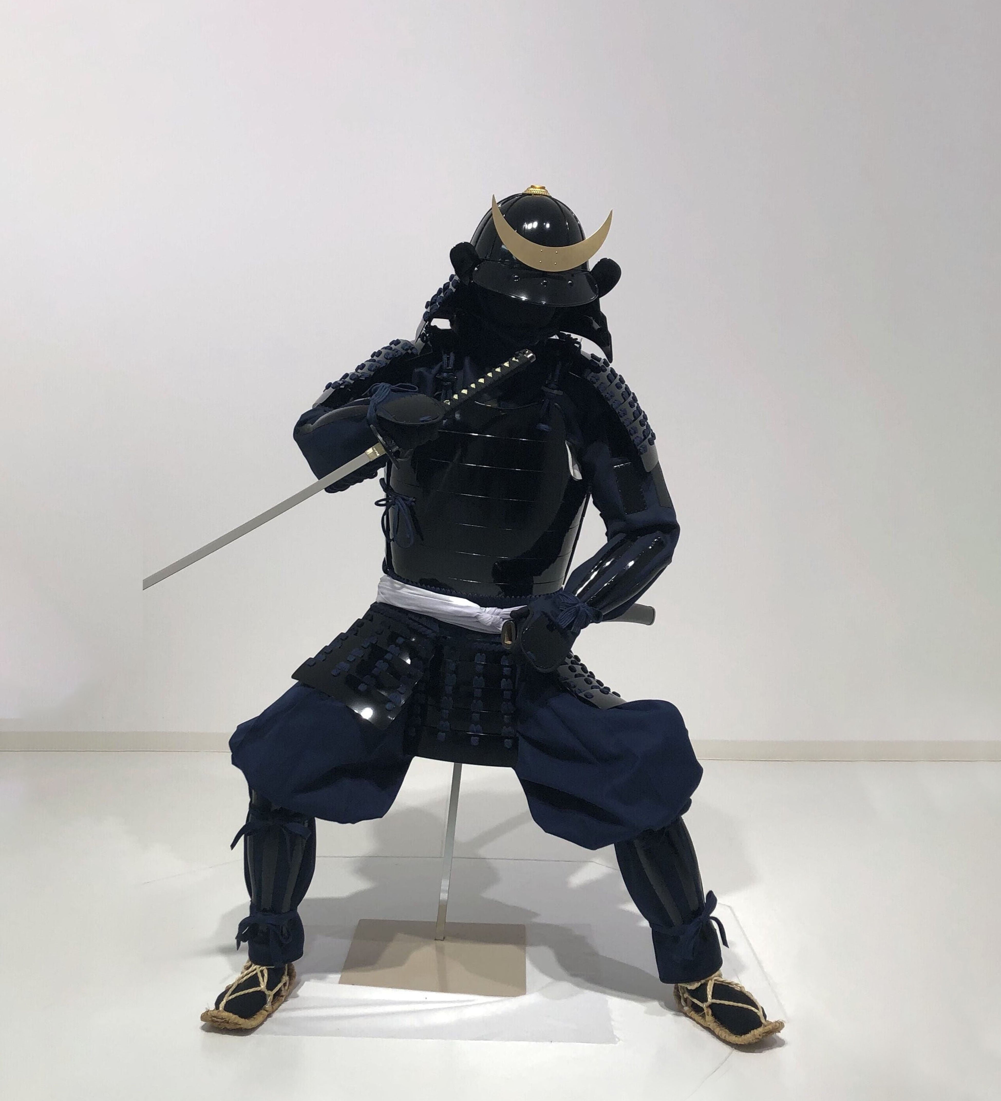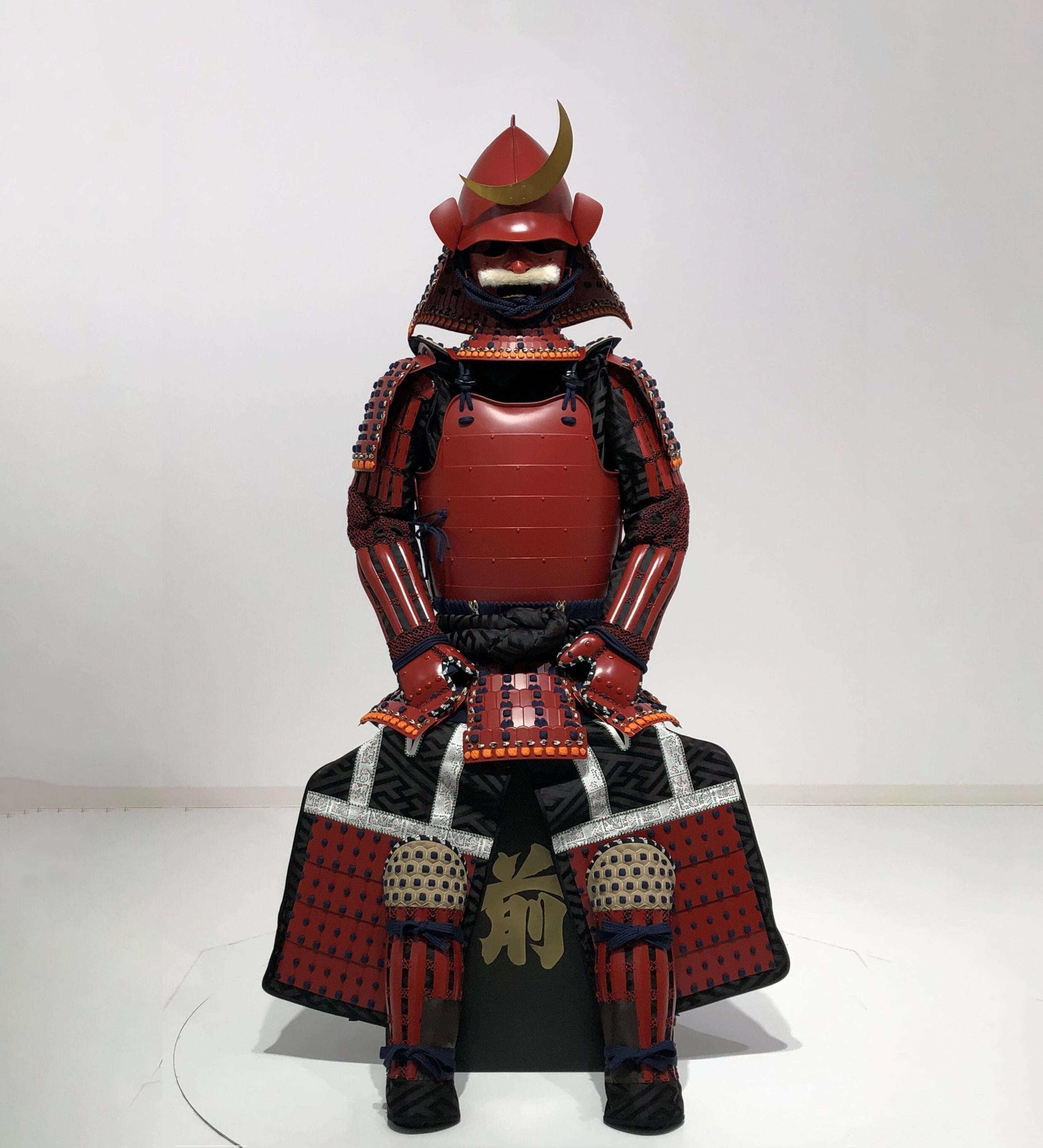 【O-079】Deep navy blue thread laced red matte riveted two-piece cuirass armor with peach-shaped helmet:濃紺糸威赤艶消鋲綴二枚胴具足(桃形兜)