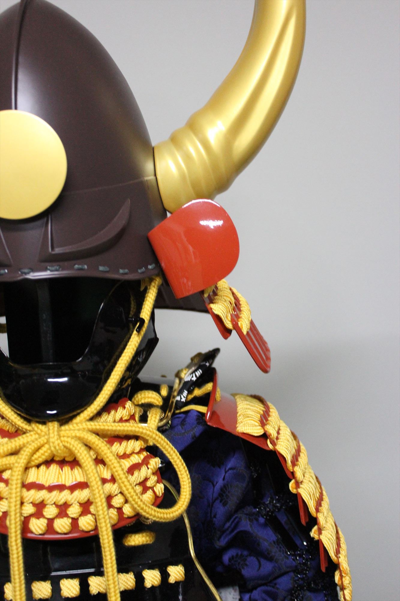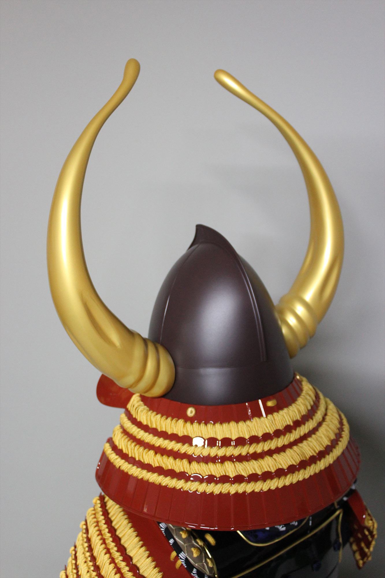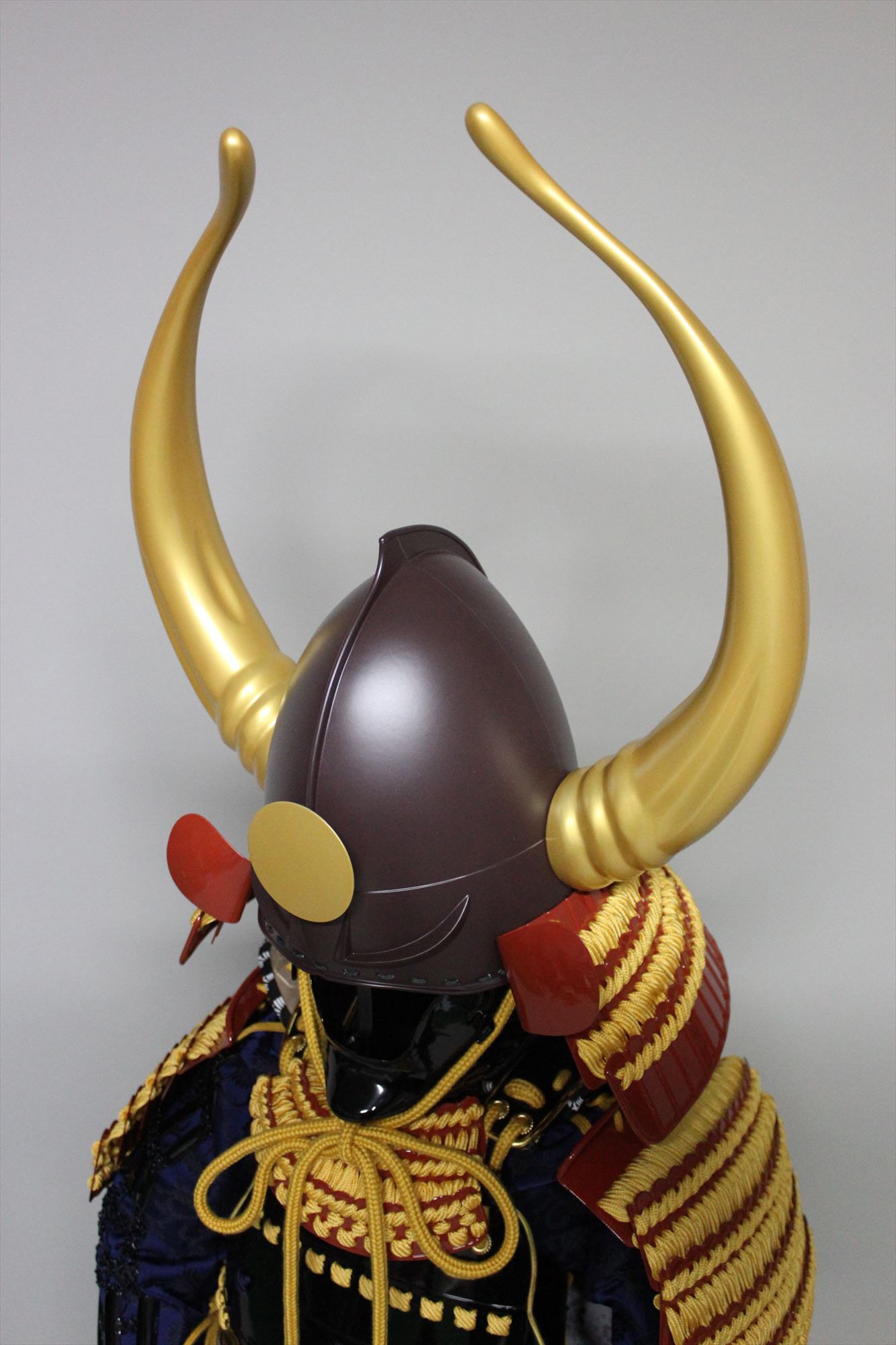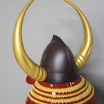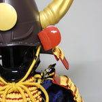 ●Specifications: Helmet bowl, iron rust-painted peach-like surface, black and red painted cheek surface, gold-painted large wooden buffalo side stand (FRP), sun wheel (wooden)