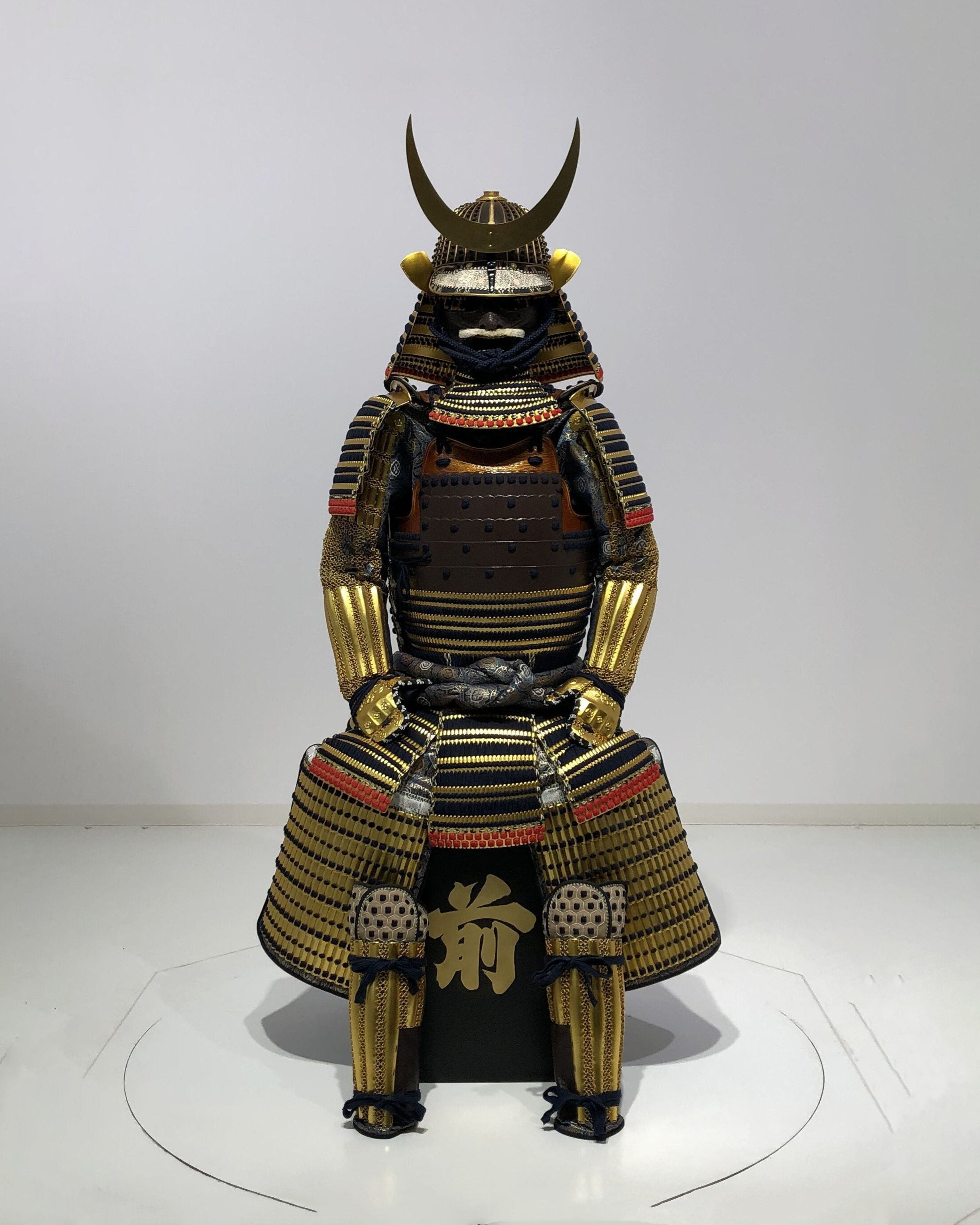 Sashiki: Gold foil stamped contemporary small bills, dark blue threaded, five-tiered Hineno sashiki Do: Iyo bills, brown hammered lacquer, gold contemporary tiered, sewn, two-piece do: Armor sleeves: Gold foil stamped contemporary small bills, dark blue threaded, six-tiered (with crown plate)