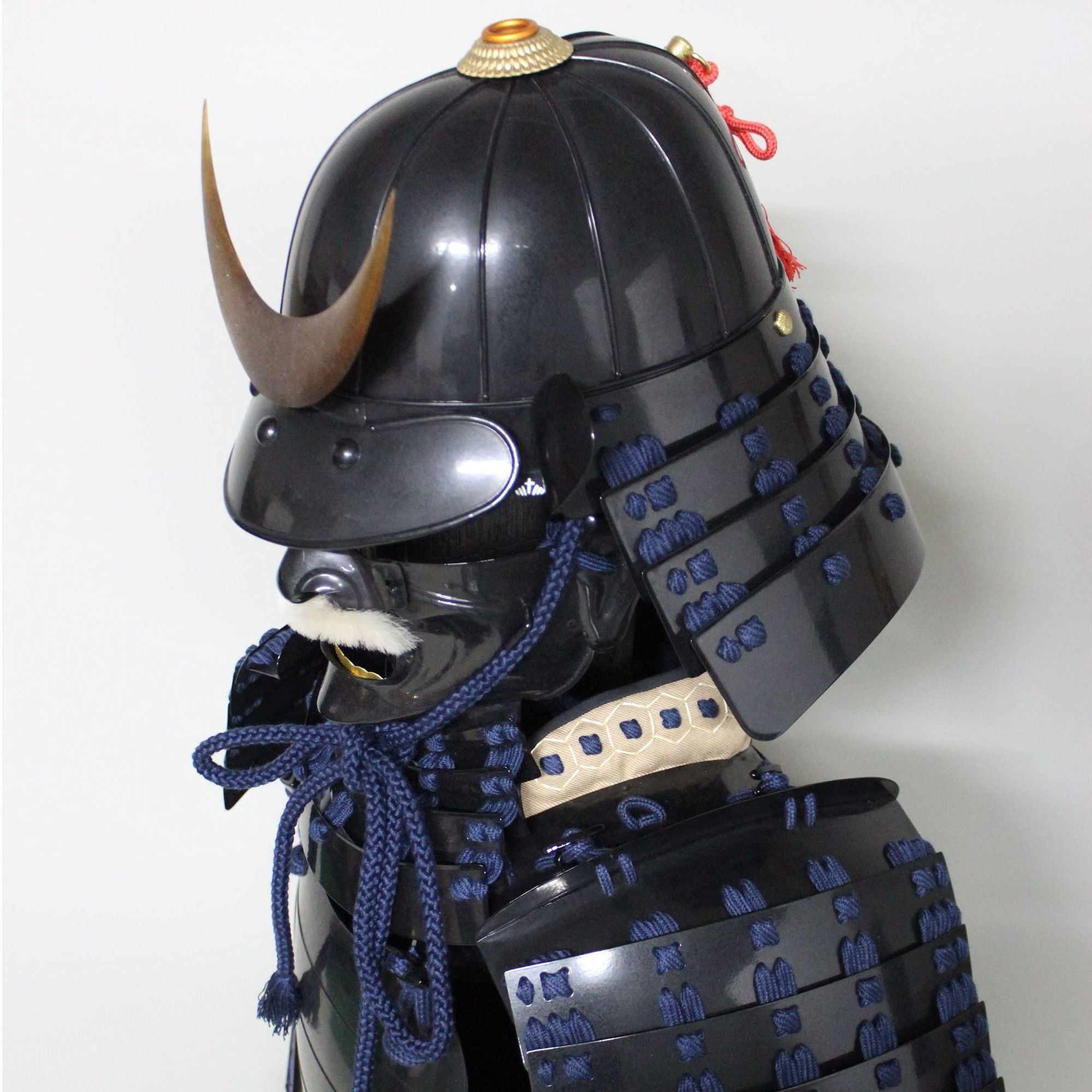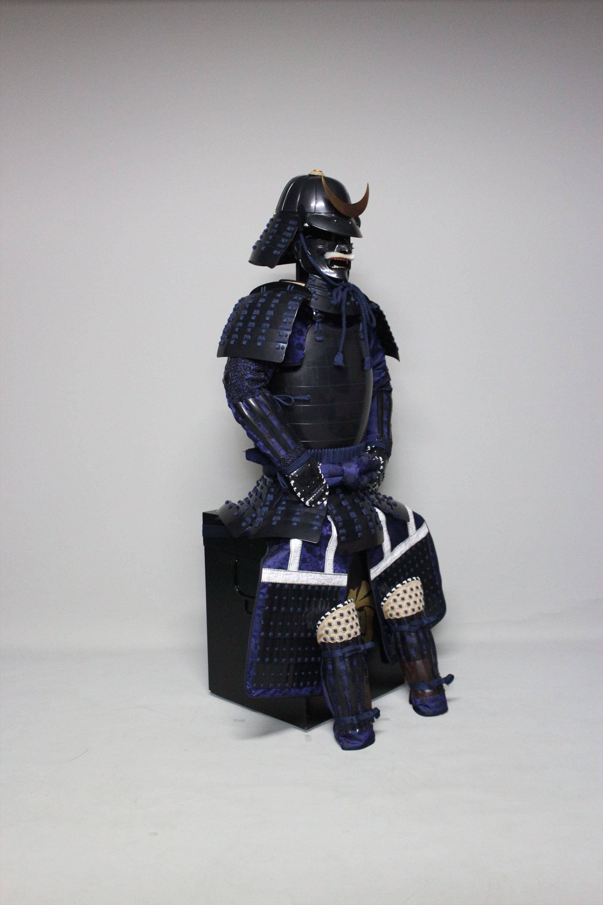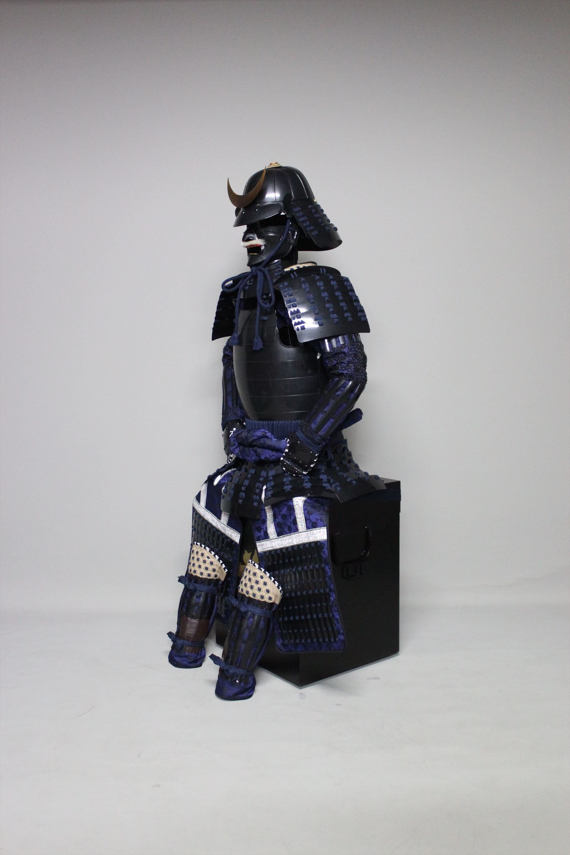 【O-065】Dark Navy Blue Thread Laced Black Barrel Side Two-Piece Cuirass Armor (Hand-Finished Matte Lacquer):濃紺糸威黒桶側二枚胴具足(手時代塗)