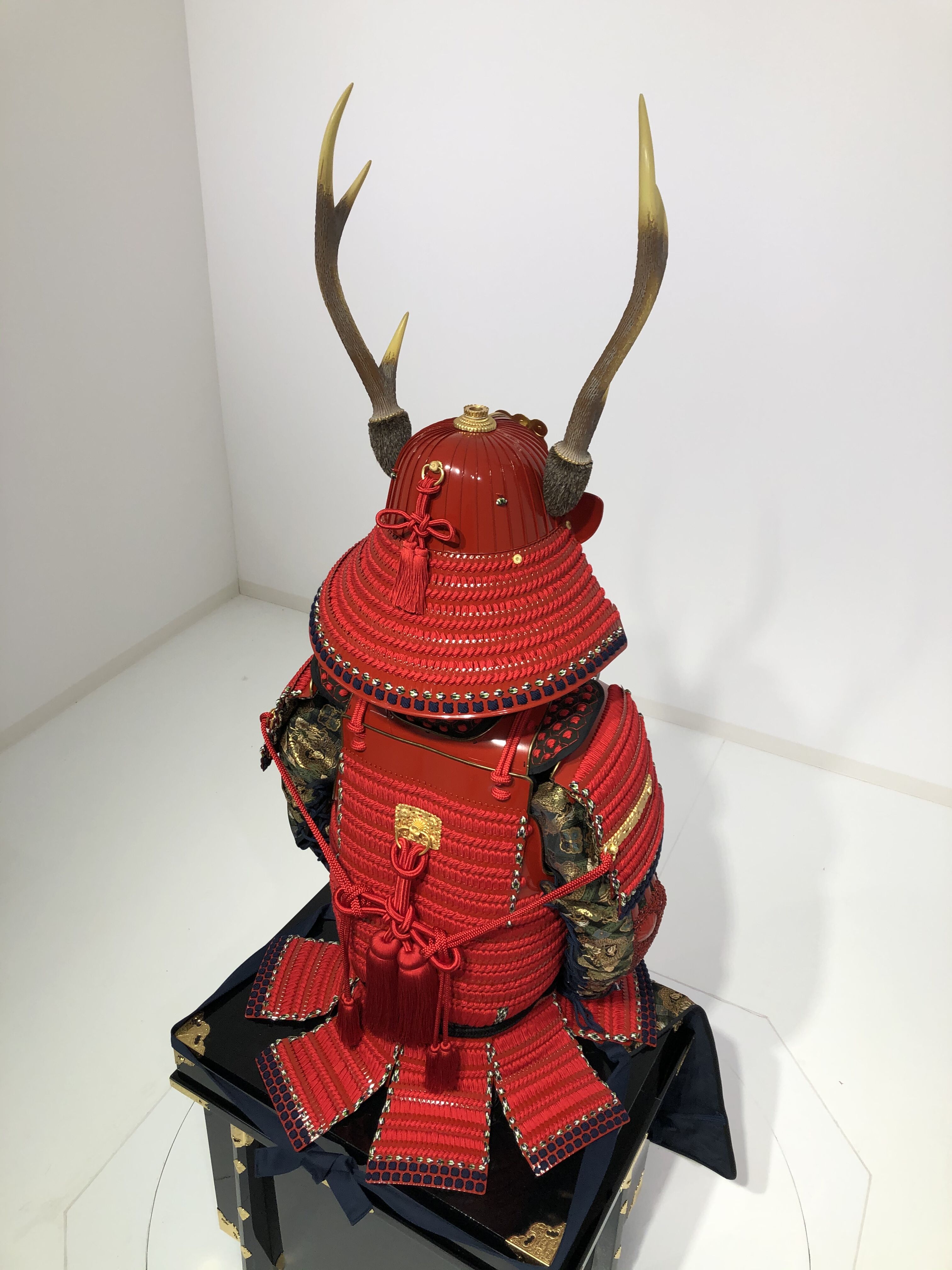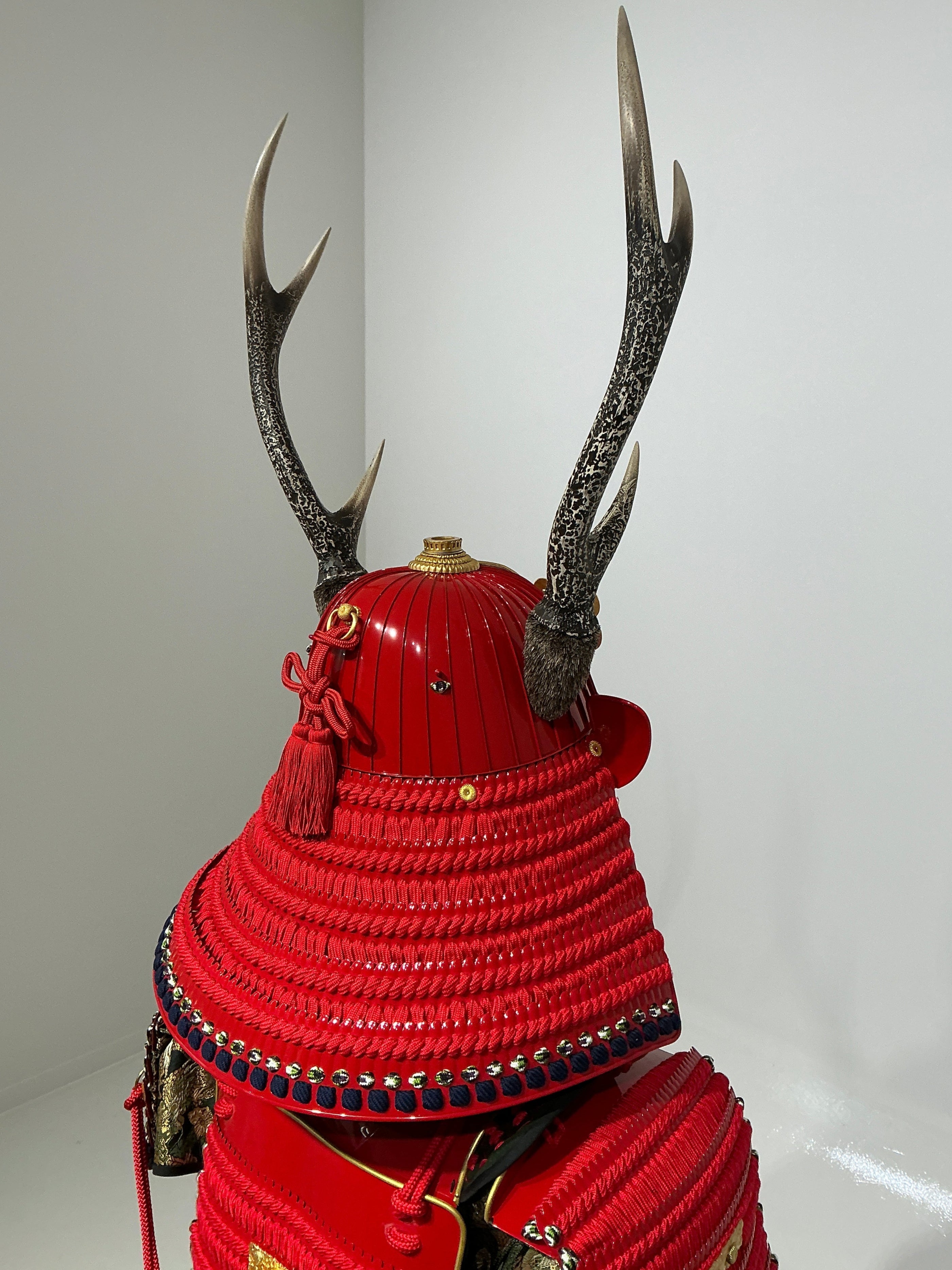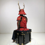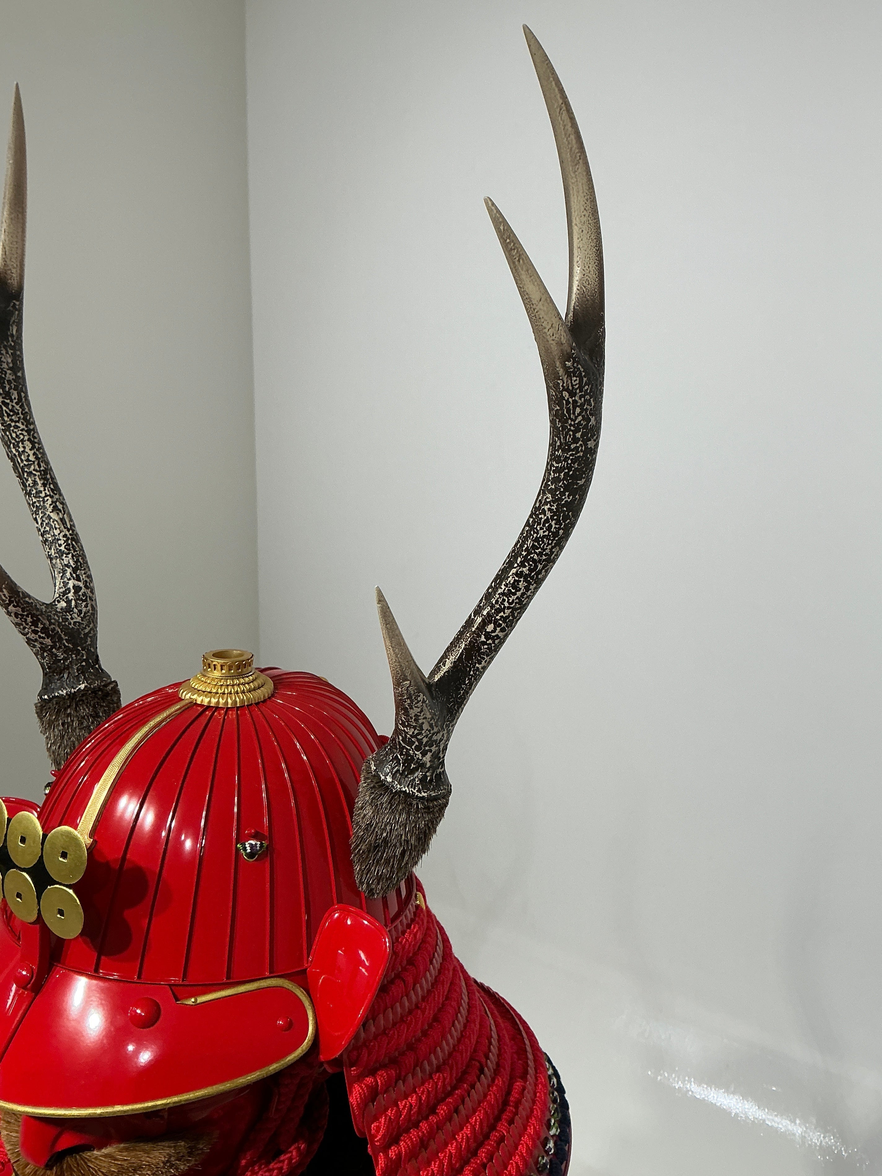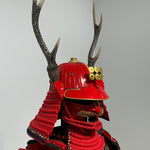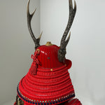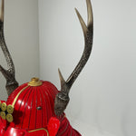 ●Specifications Helmet bowl: Red lacquer 32-ken stripe helmet front piece: Real gold leaf 6-mon coin front piece Side pieces: Wooden antler side pieces (horsehair at the base of the antlers)