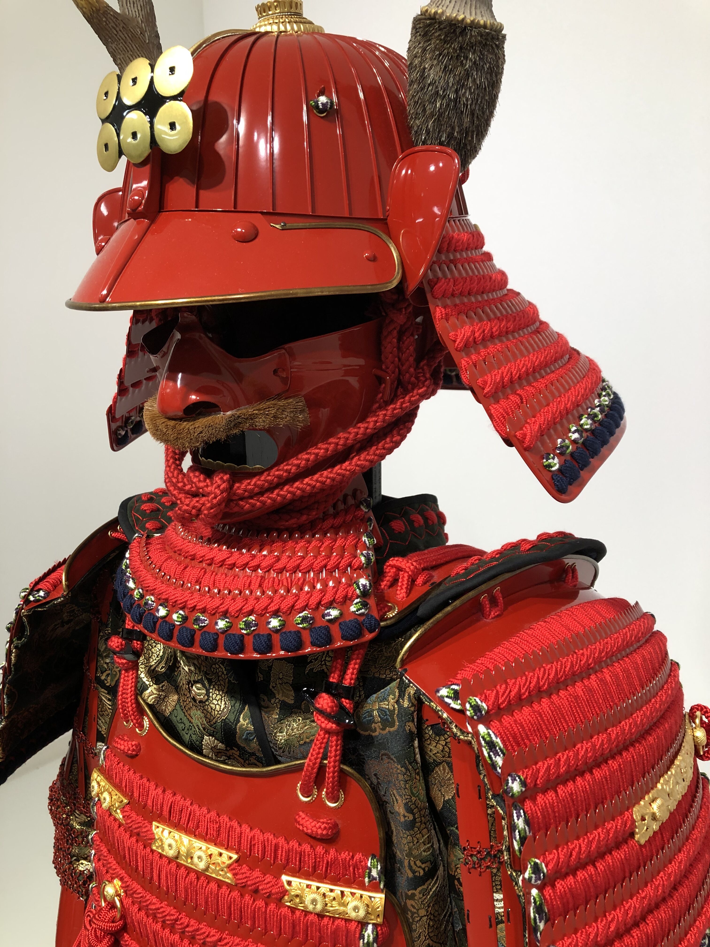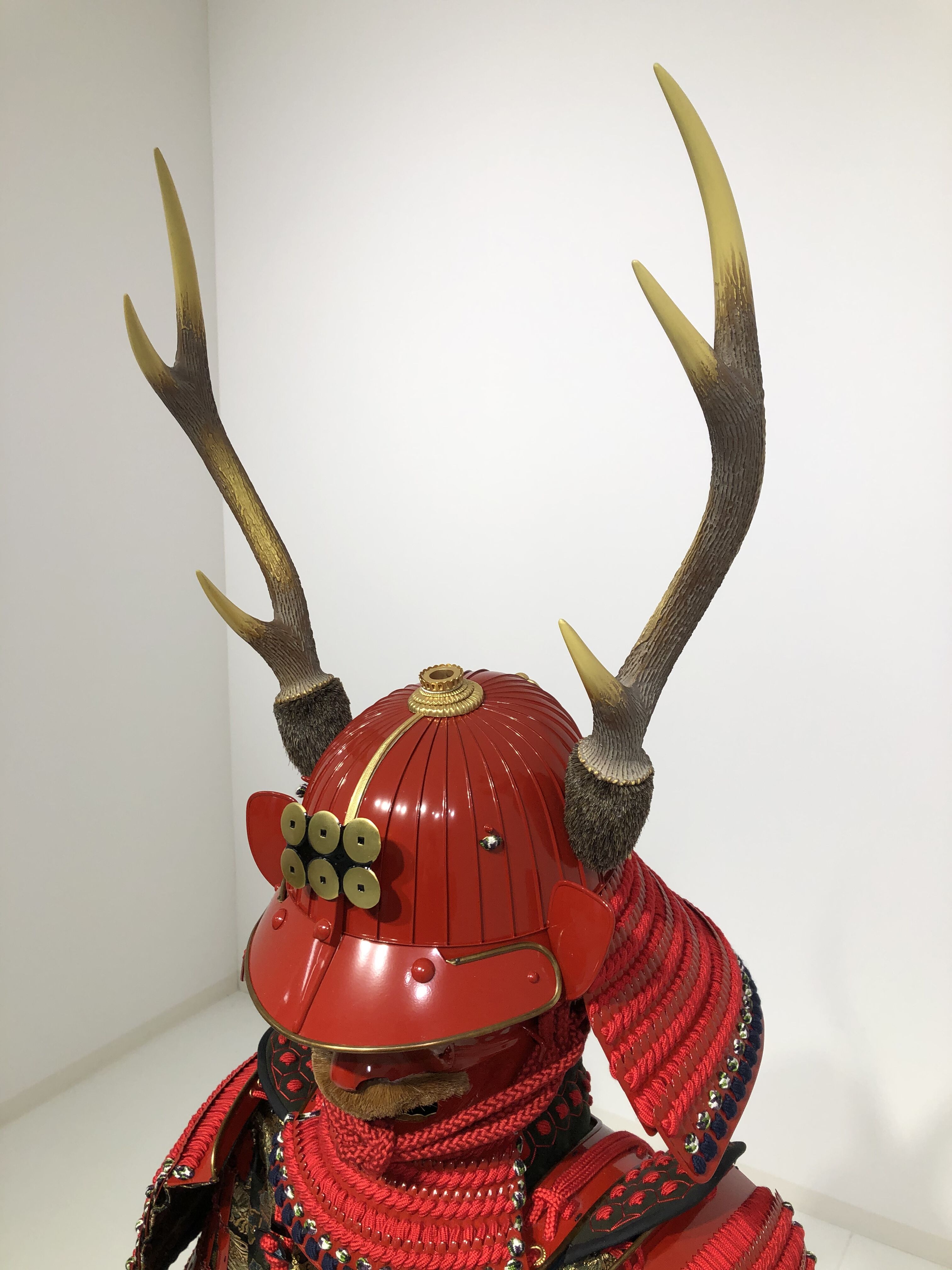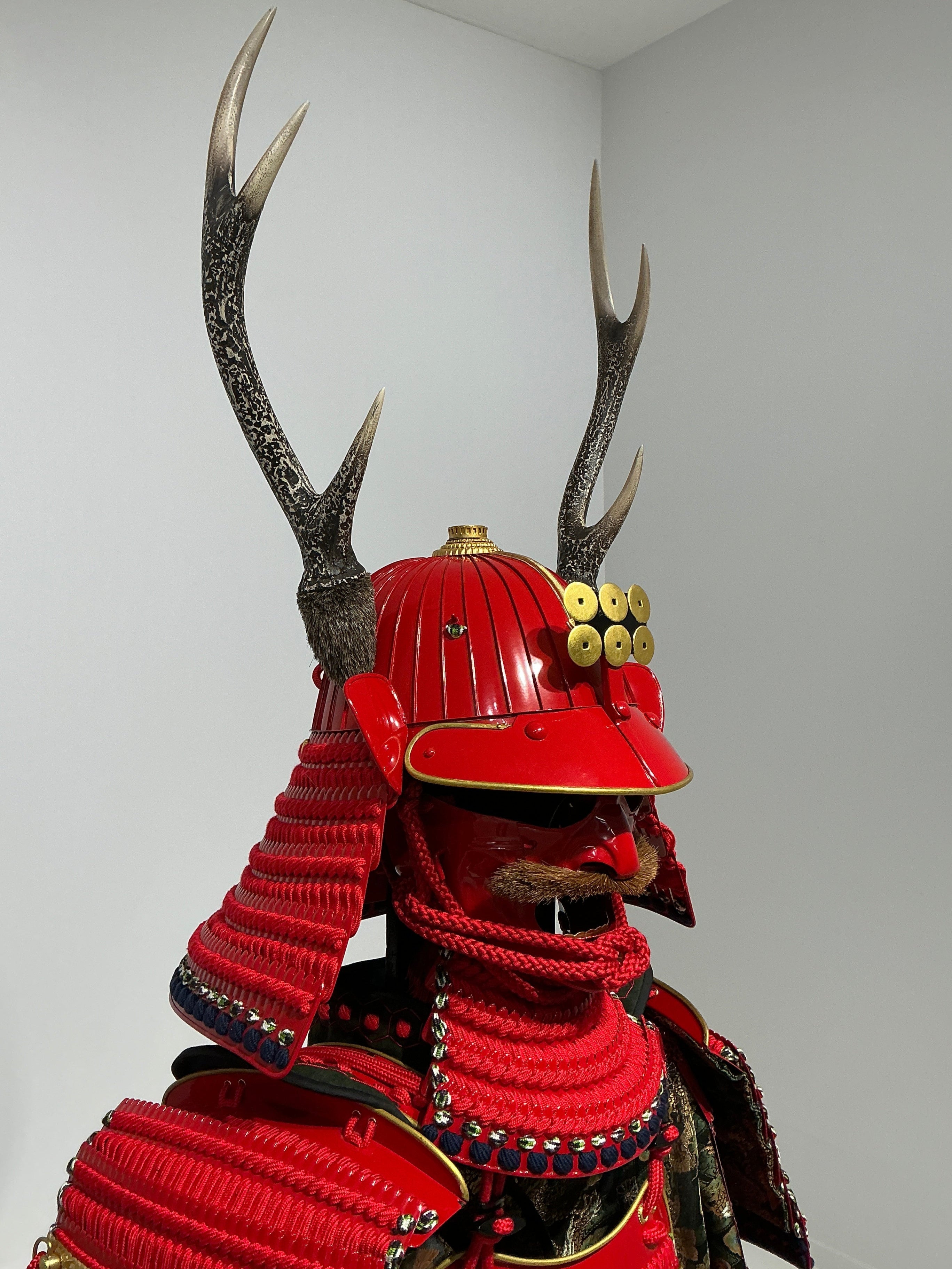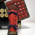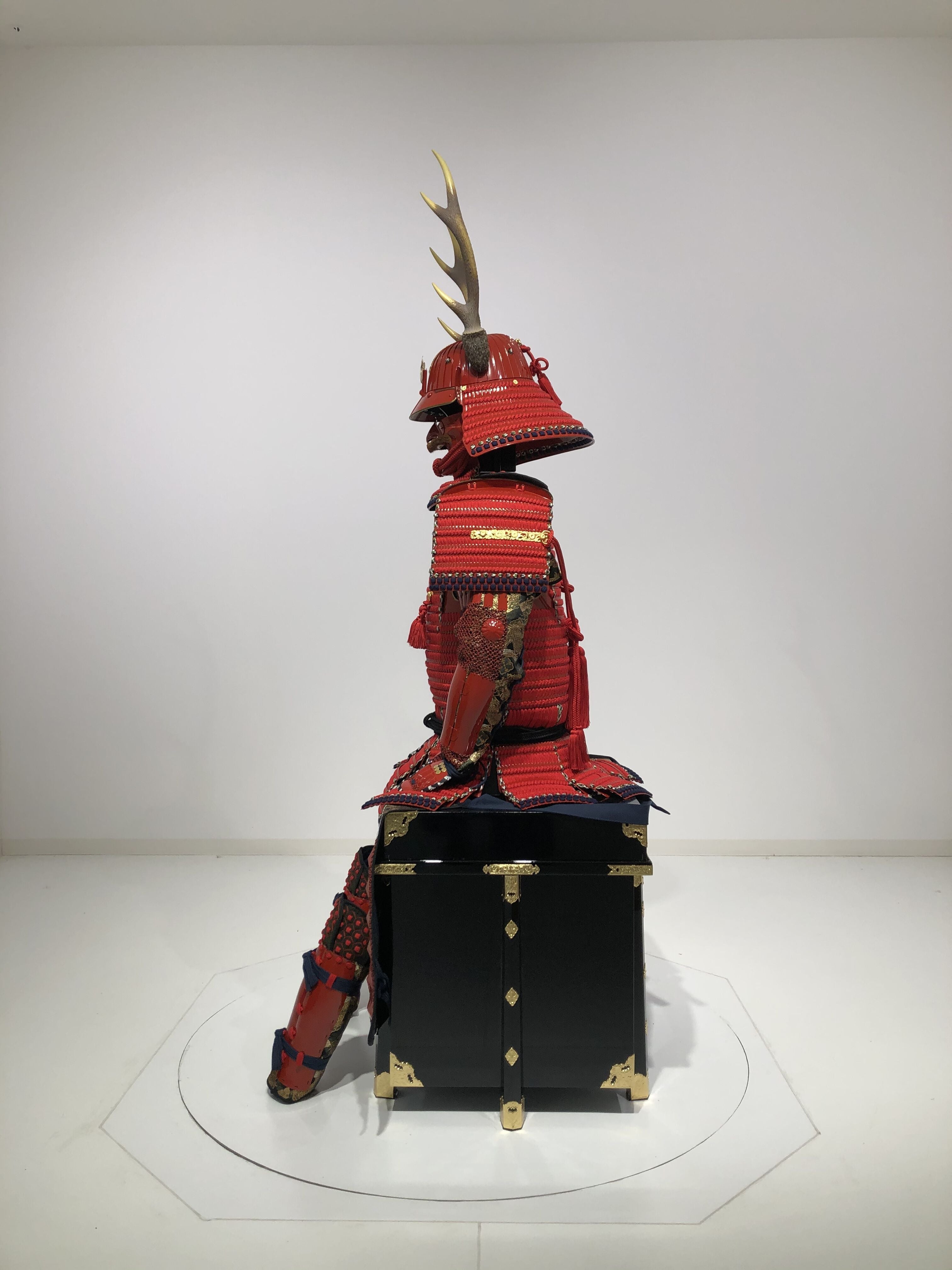 ●Specifications Helmet bowl: Red lacquer 32-ken stripe helmet front piece: Real gold leaf 6-mon coin front piece Side pieces: Wooden antler side pieces (horsehair at the base of the antlers)