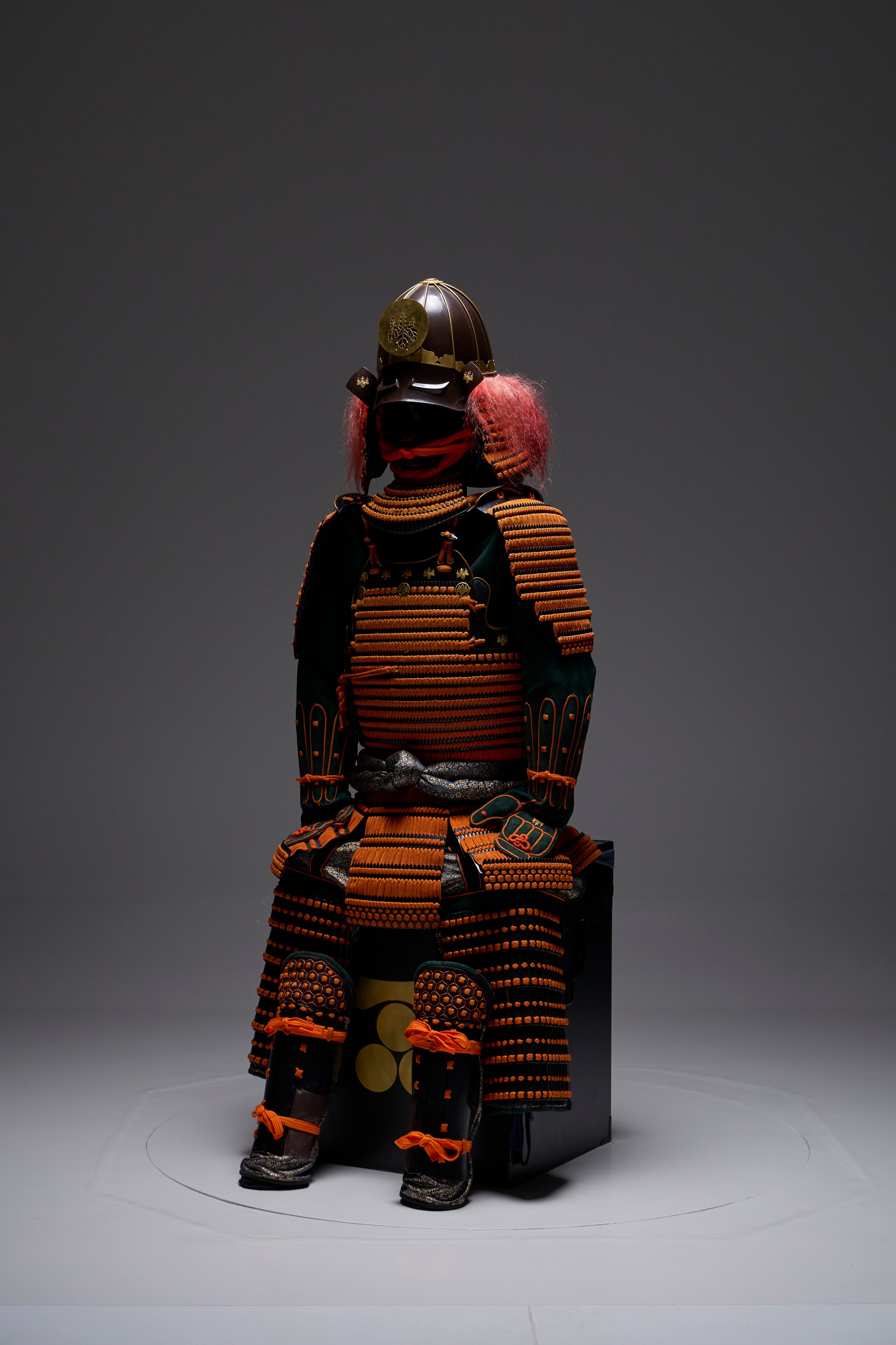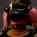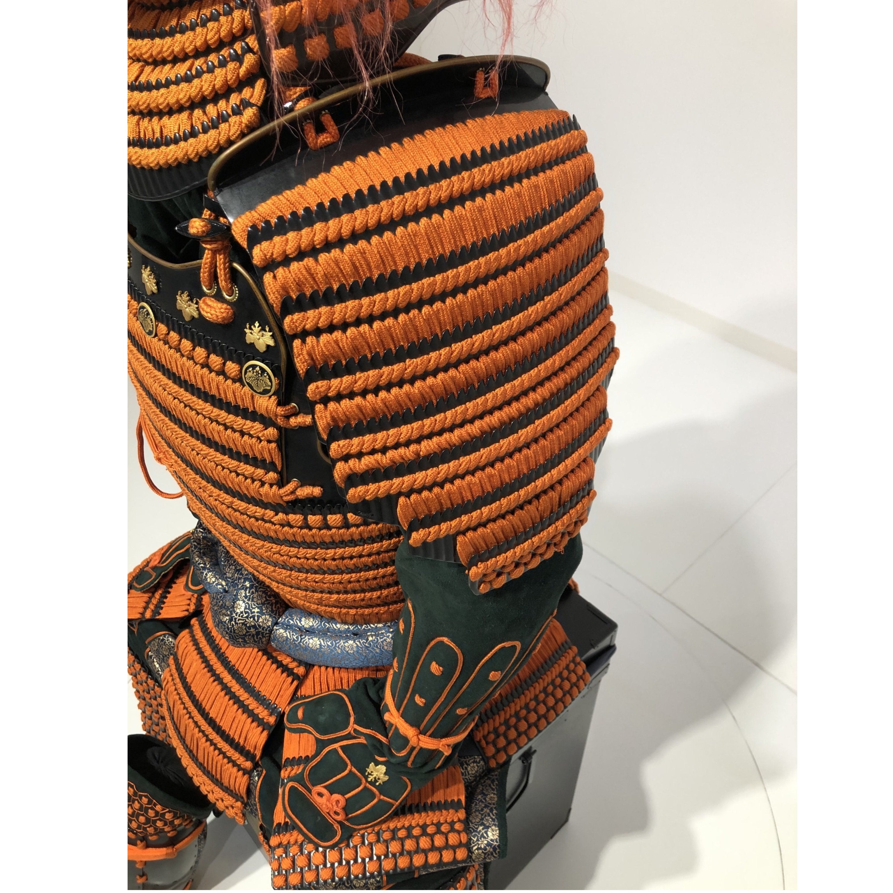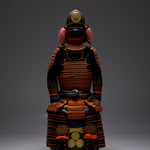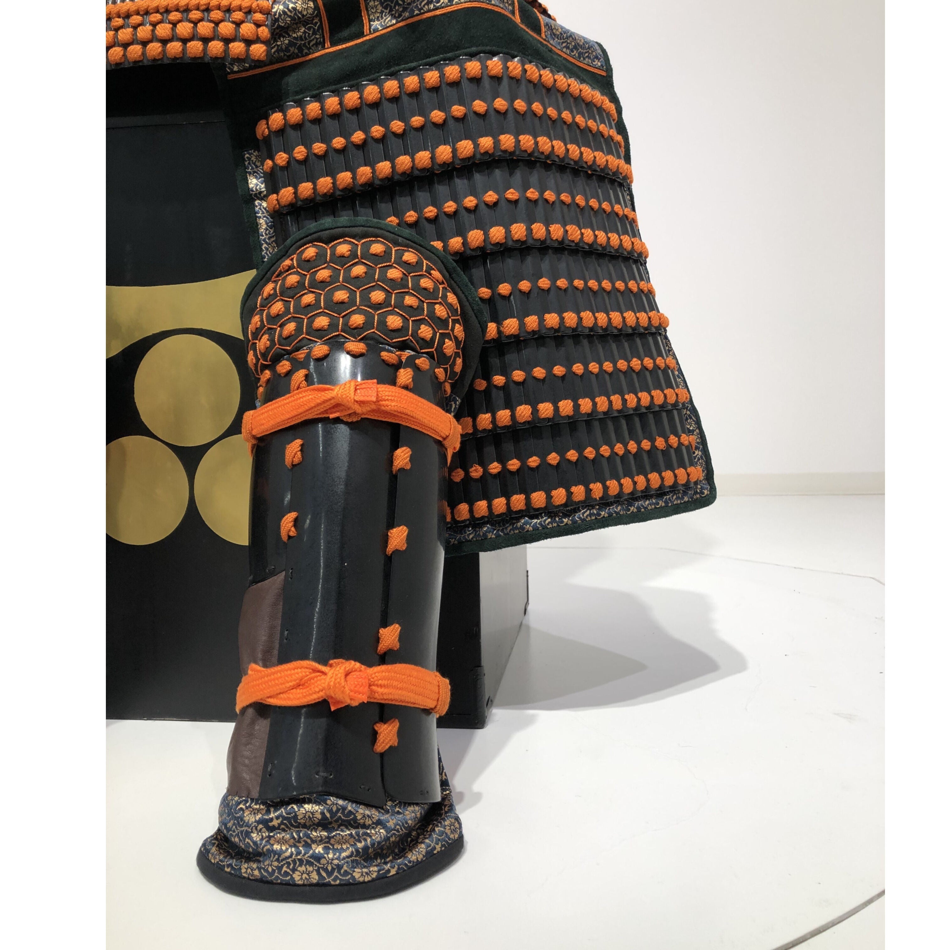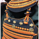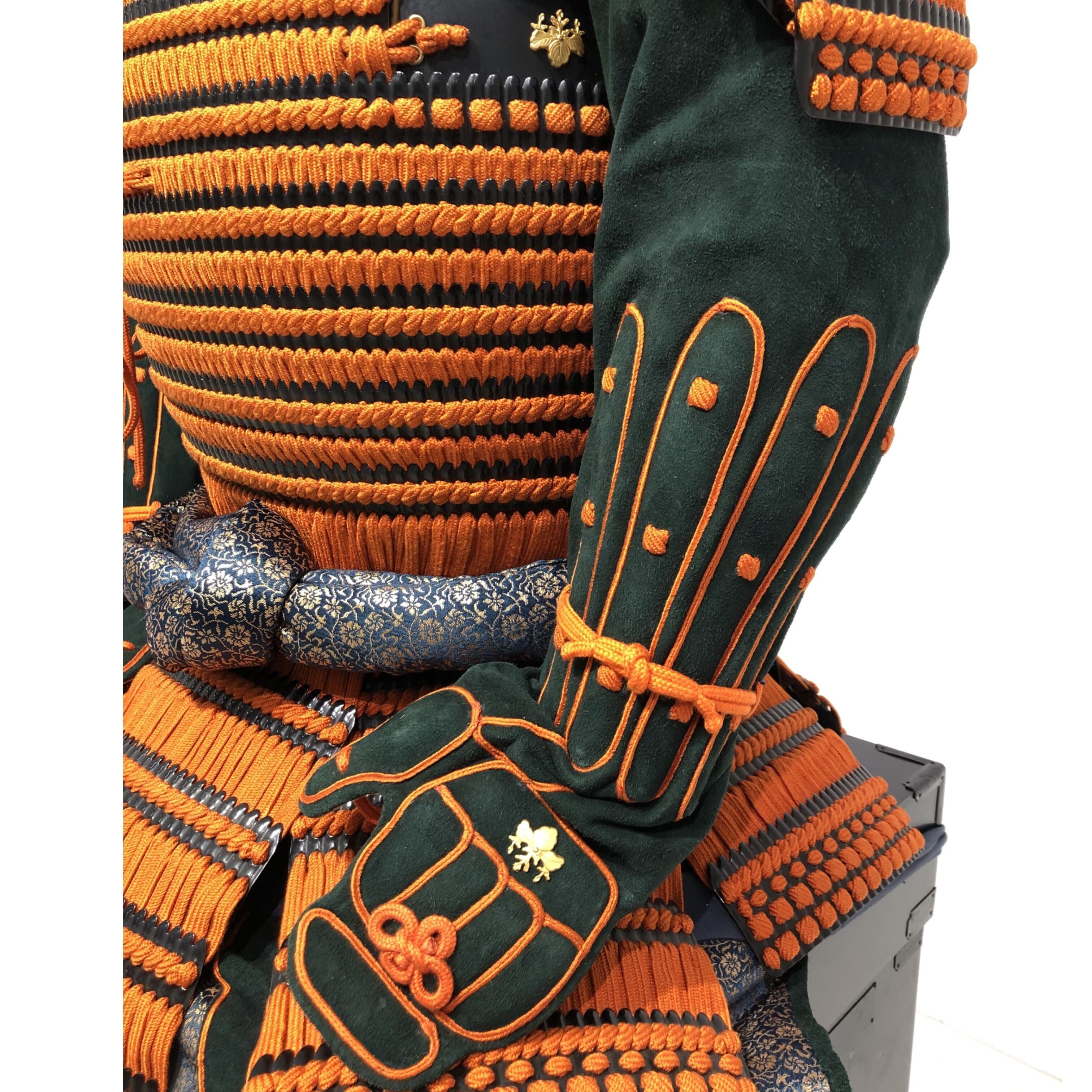 ●Specifications: Bowl: Tea-style painted 10-ken rim; Shimizu-gata suji-zukuri helmet stand; Genuine gold leaf-pressed paulownia crest shoulder strap; Black-style painted scarlet-dyed contemporary small bills; Five-tiered torso; Black-style painted scarlet-dyed contemporary small bills; Two-piece torso sleeves; Black-style painted scarlet-dyed contemporary small bills; Seven-tiered grass skirt; Black-style painted scarlet-dyed contemporary small bills; Four-tiered gauntlets; Three black leather pouches; Shino-gauntlets; Black-style painted three-piece; Tsutsumi-gai-date; Black-lacquered board-style gauntlets