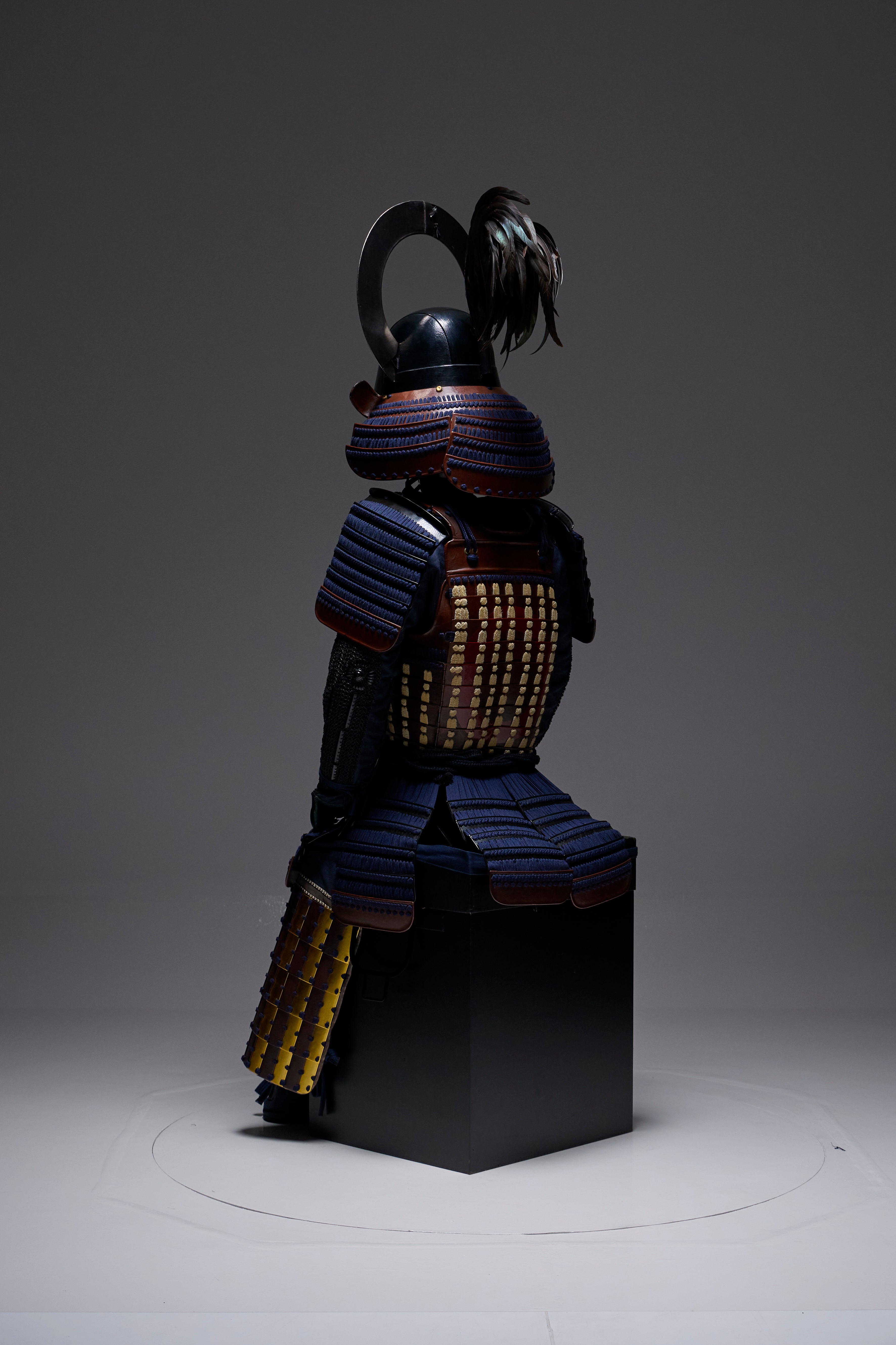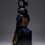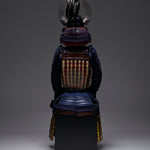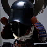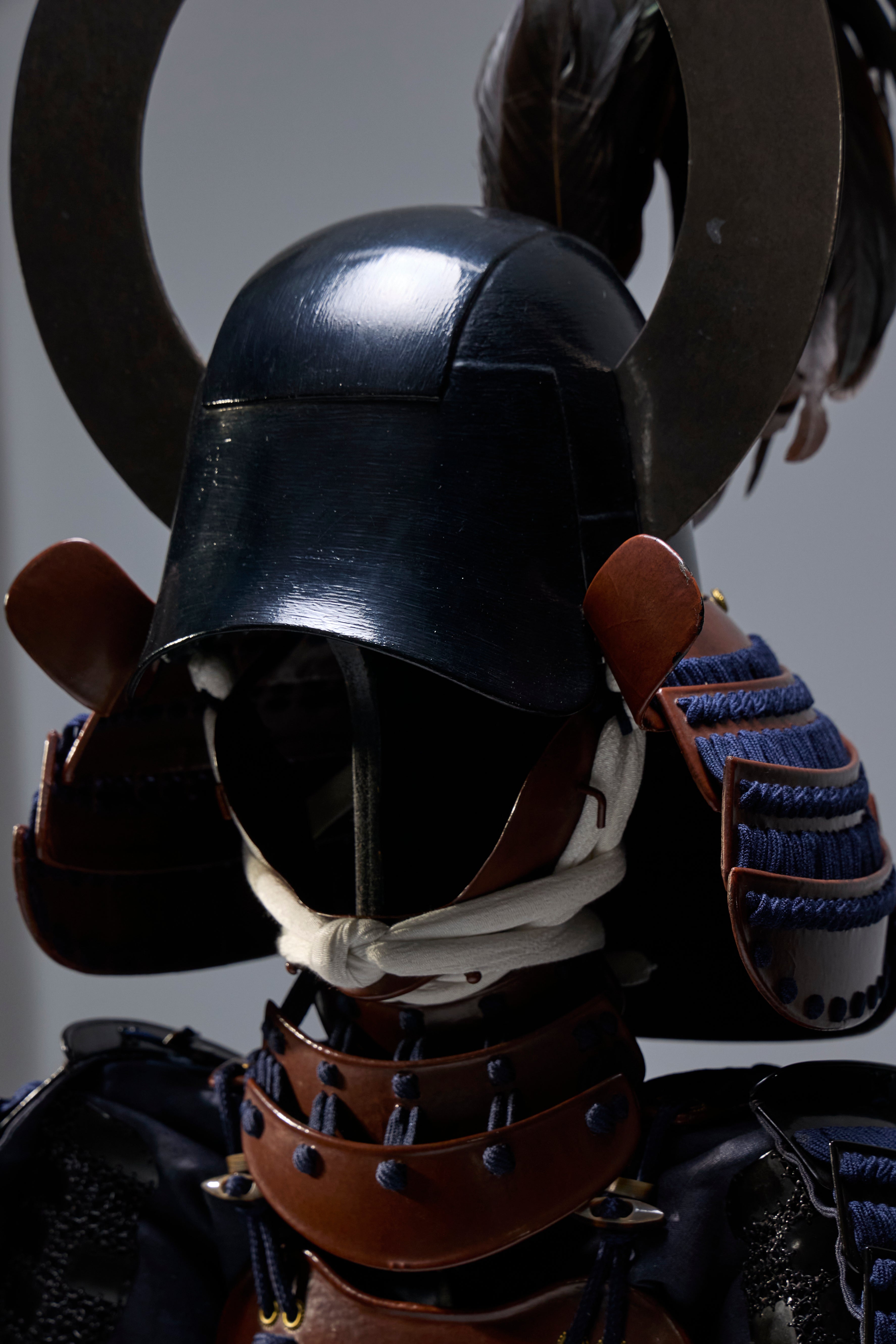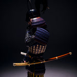 Bowl Black brushed Echizen head-shaped helmet stand Smoked silver foil pressed ring-cut side stand and ring-cut chicken feather sashimo Tea-style lacquer Dark blue thread armor Four-stage side and five-stage back sashimo body Tea-style lacquer iron wrinkled leather wrapping sun wheel pattern top sleeve Black-style lacquer Dark blue thread armor board six-stage (sixth stage brown lacquer wrinkled leather wrapping)